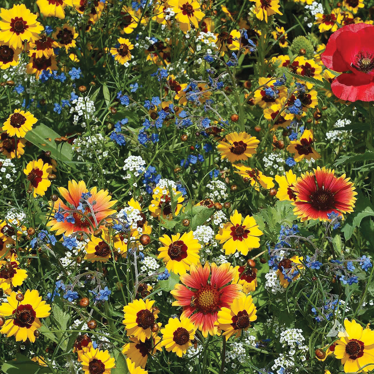 Contains: Baby Blue Eyes, Bergamot, Blue Flax, California Poppy, China Aster, Chinese Forget-Me-Not, Corn Poppy, Fleabane Daisy, Globe Gilia, Indian Blanket, Lance-Leaved Coreopsis, New England Aster, Plains Coreopsis, Purple Coneflower, Purple Giant Hyssop, Siberian Wallflower, Sweet Alyssum, Tidy Tips.