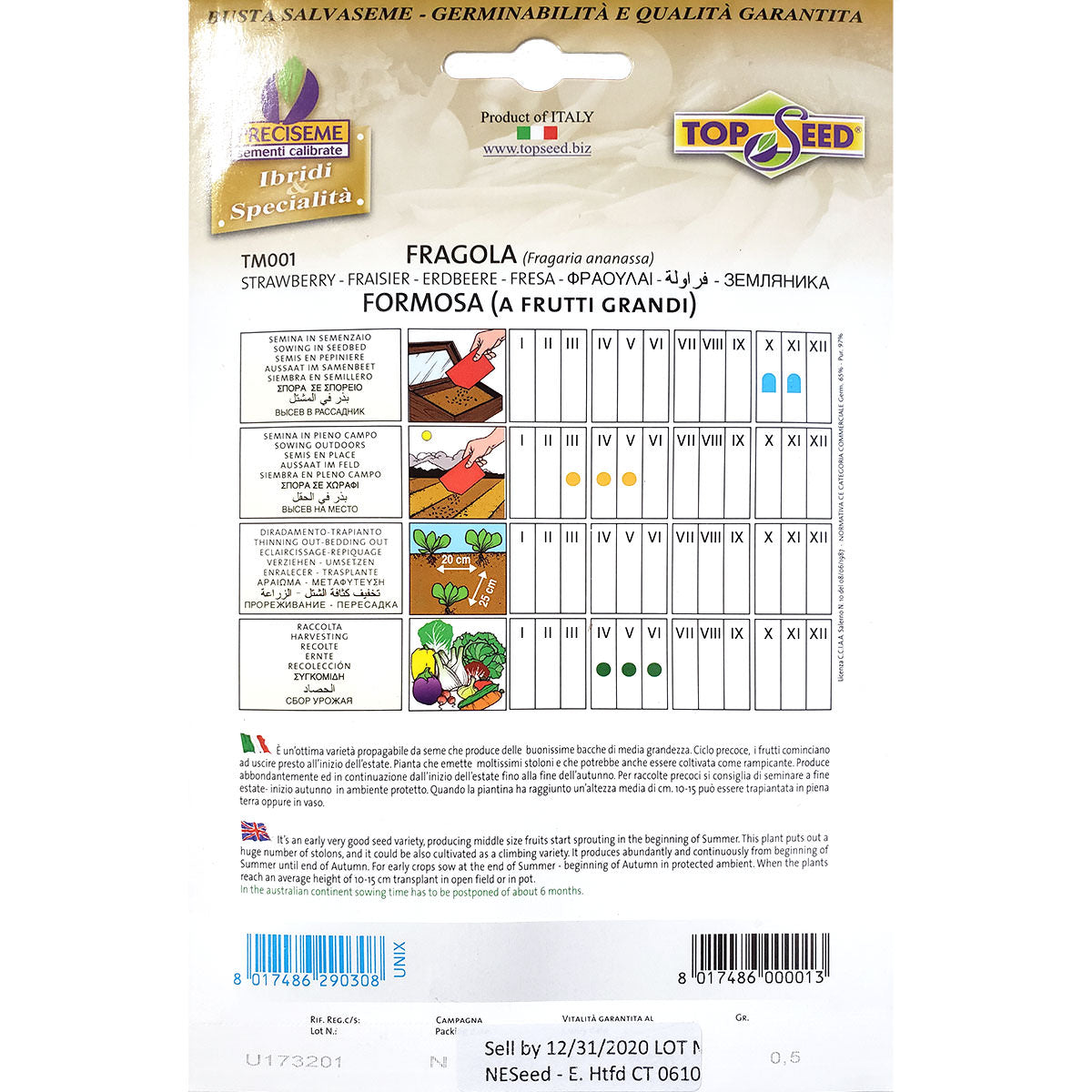 A ‘day neutral’ seed raised variety from Italy. Perennial plants will produce an abundance of sweet medium sized fruit from early summer until frost once established. Start seed inside in early winter and transplant to the garden in spring. For early crop, plant in late summer. Vigorous plants produce many stolons and can be grown as hanging variety. 110 days from seed. Available only in packets (1/2 g/pkt).