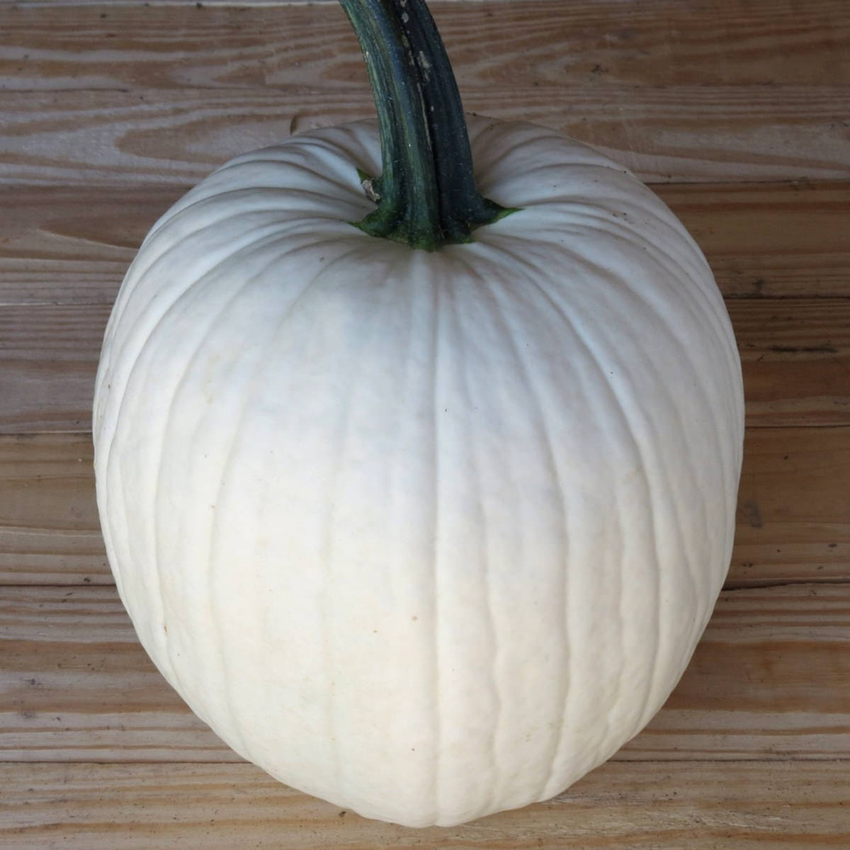 (12-16 lbs.) This white pumpkin is the new, larger version of Moonshine. White skin with a strong dark green handle. Skin can be smooth or bumpy with deep ribbing. Harvest when first mature and protect from the sun to hold white color. Averages 3-5 fruits per vine. 110days.